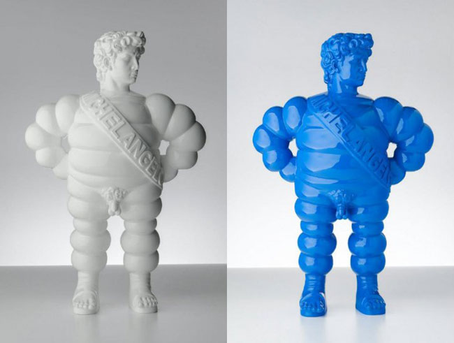 Michelangelo è un evidente omaggio dell’artista milanese ad una delle opere più note del Rinascimento italiano, il David di Michelangelo, che viene ironicamente accostato a Bibendum, la nota mascotte del brand di pneumatici Michelin.