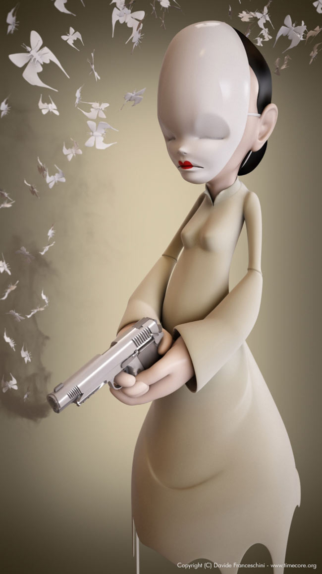 Sam Flores ha collaborato con Davide Franceschini per la realizzazione della scultura digitale di Butterfly Gun. Come vedete dall’immagine, si stratta di una ragazza (Sam la chiama Fatima) che indossa una maschera bianca e impugna una pistola. Dalla canna dell’arma vediamo uscire del fumo e delle farfalle.