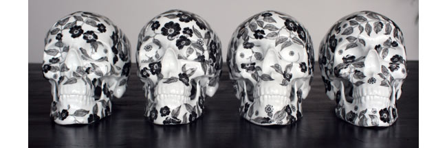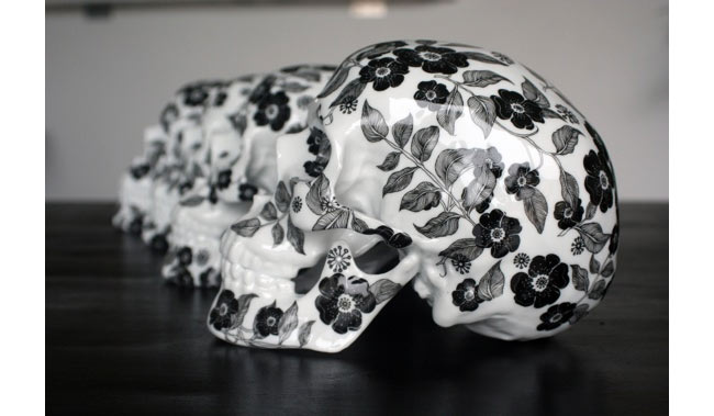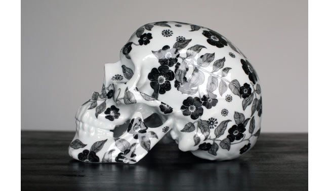 Skull Fleurs Noires è un teschio in porcellana di Limoges prodotto da K.Olin Tribu, su design dell’artista francese NooN. La tiratura è limitata a 50 pezzi e la posizione del decoro floreale è stata curata personalmente da NooN, in modo che ogni teschio fosse diverso dagli altri.
