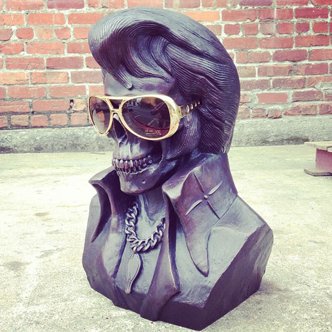 Frank Kozik ha postato delle foto davvero interessanti su Instagram! Gli scatti riguardano le lavorazioni finali del busto in bronzo di Dead Elvis: una volta uscito dallo stampo viene scurito usando dell’acido, viene poi passato sotto una fiamma viva e mentre è ancora caldo viene spennellato con della cera.