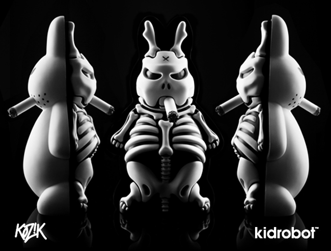 Eh sì, questa volta il coniglio di Frank Kozik se ne sta ritto in piedi ed ha due facce, una standard e una scheletrica!