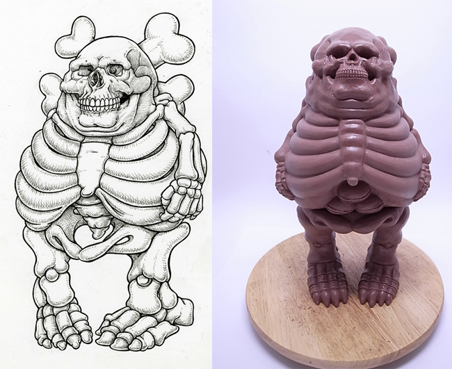 Dopo aver visto il faccione scheletrico di Big Boner sul libro “Stickable Art Offenses” di Ron English, a Nigo di BlackBook Toy è venuta l’idea di realizzare un toy basato su questo personaggio. Nigo ha quindi contattato l’artista americano affinché disegnasse Big Boner a figura intera e poi ha passato lo schizzo allo scultore T9G che ha realizzato il prototipo che vedete nelle immagini. Non si sa esattamente la data di uscita, ma considerando l’approssimarsi del SDCC e del Taipei Toy Fes la release sembra davvero dietro l’angolo!