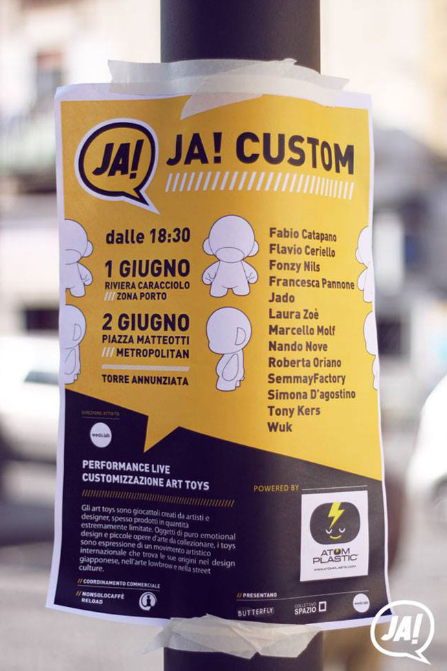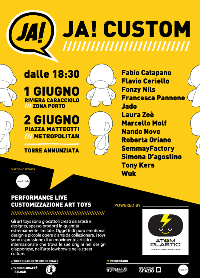 Tra le varie attività organizzate, segnaliamo JA! Custom, evento in cui gli artisti Fabio Catapano, Flavio Ceriello, Fonzy Nils, Francesca Pannone, Jado, Laura Zoè, Marcello Molf, Nando Nove, Roberta Oriano, SemmayFactory, Simona D’Agostino, Tony Kers e Wuk dipingeranno dal vivo sui nostri Mini Munny.