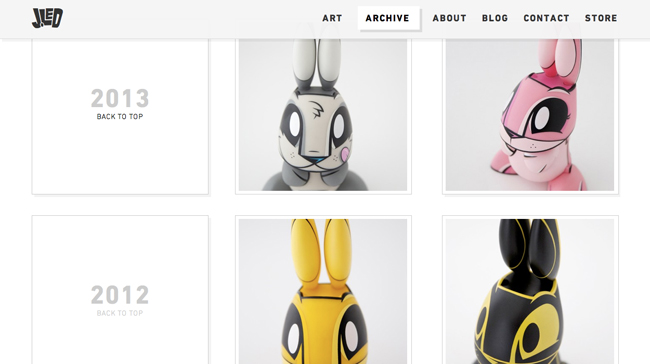 A fianco del blog istituzionale e dell’immancabile negozio, troviamo un interessante portfolio con dipinti e custom toy e un enciclopedico archivio che raccoglie praticamente tutte le produzioni di J.Led, dalle prime magliette autoprodotte al Qee creato per il contest Design-A-Qee di Playlounge x Toy2R, dal Fire Cat di Wheaty Wheat al Teeter di Kidrobot, dai cuscini di This A Limited Edition al Mr. Bunny di The Loyal Subject.